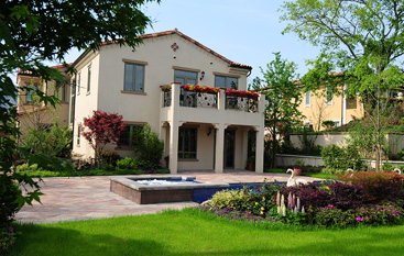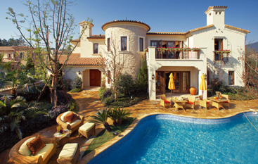 西班牙建筑形体自由活泼,屋顶层次起伏,出檐较浅,有大大小小的露台、铁艺栏杆等立面元素,外墙采用浅色调抹灰。